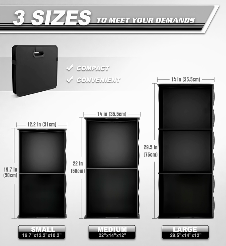 Denne 3-størrelses bærbare sammenleggbare vanntette bagasjeoppbevaringsvesken for enhver bil er tilgjengelig i 3 størrelser, hvorav en er 75x35,5x30,5 cm, veier 1,45 kg og inneholder 5 stykker i en boks. Den bruker høykvalitets Oxford-duk med PP-plate eller MDF-plate, og bruker en 210D-fôr innvendig, som er både solid og slitesterk og har god vanntett ytelse. Den sammenleggbare designen gjør at oppbevaringsvesken enkelt kan brettes sammen når den ikke er i bruk, noe som sparer plass og er lett å bære. Enten det er en sedan, SUV eller andre modeller, kan den enkelt tilpasses og er et ideelt valg for innvendig oppbevaring og organisering.
